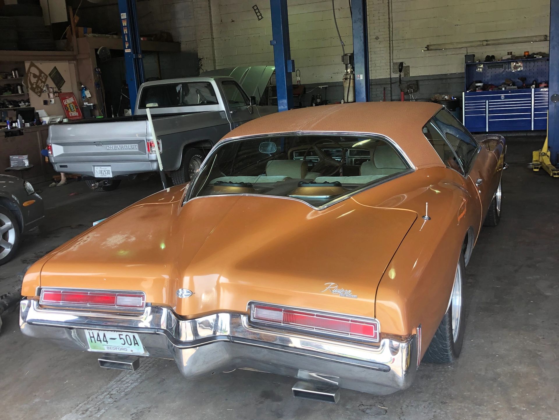 • The “boat-tail” rear end, inspired by the 1963 Corvette Sting Ray, featured a large, sloping rear window and integrated trunk lid, making the Riviera’s design both controversial and iconic.